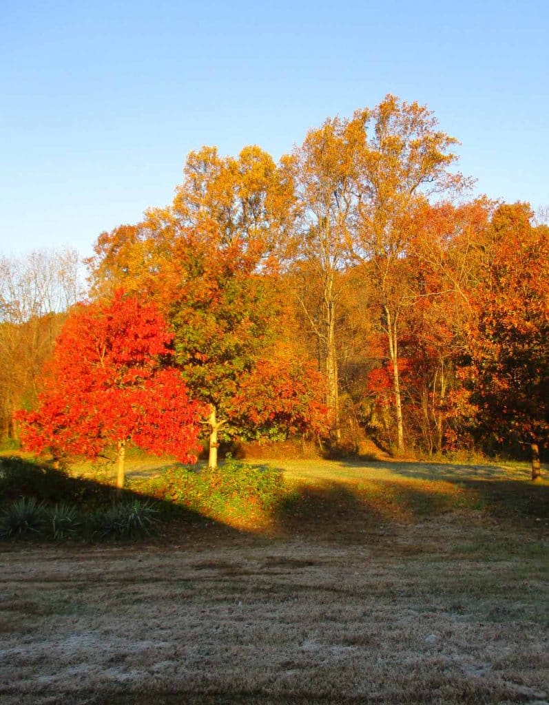 I woke at sunrise and quietly walked to a back window. The morning sun flamed the little dogwood’s turning leaves. It’s normal Autumn color is a dark ruddy red that does not stand out. The frost in the foreground, the brown leaves of trees at the base of Little Yellow Mountain, and the still morning still made a scene by themselves with the little tree, but the early morning sunlight changed everything. The little tree became the centerpiece.