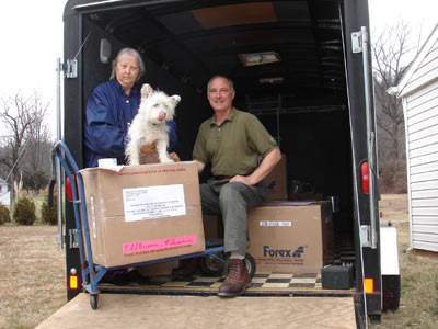 House of Another Color. Last fall we transformed the house again. The biggest rooms became sorting stations. The smaller rooms had the stuff. A nearby cottage took the overflow. We needed to send a second batch of boxes, but the batch grew….and grew…and grew. Special boxes were marked with a piece of pink tape, because we were planning to go for a year starting in the Spring of 2012. Each box goes through the same procedure: individually organized and packed; each item listed on paper; boxes are carefully taped; shipping paperwork is filled out; moved and loaded into a trailer. Every time we got 10-12 ready, they were taken to Advancing Native Missions. The picture shows us with the last boxes of the early 2012 batch.
