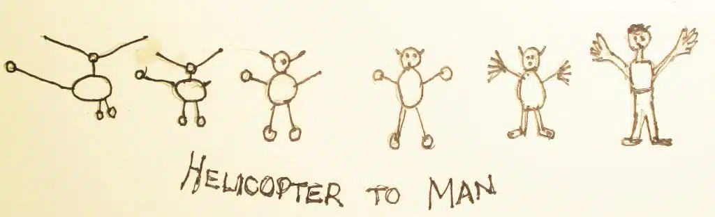 The cartoon shows a helicopter turning into a person, but the series of drawings does not make it possible or true. Likewise, the popular notion that star dust turns to living pond scum, which turns to sea life, which turn to living things on land, which turns to microbiologists at the end is not true either. Yet, it is usually taught as fact and is supposedly applicable to the whole universe. This is evolution.
