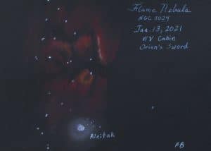 We “beamed” the video signal from a widefield setup on the telescope to the warmth of our cabin and began to sketch. 45 minutes later we changed to M78, which had eluded us in clouds the last time we looked. This time my Lovely watched me as I did a quick sketch.