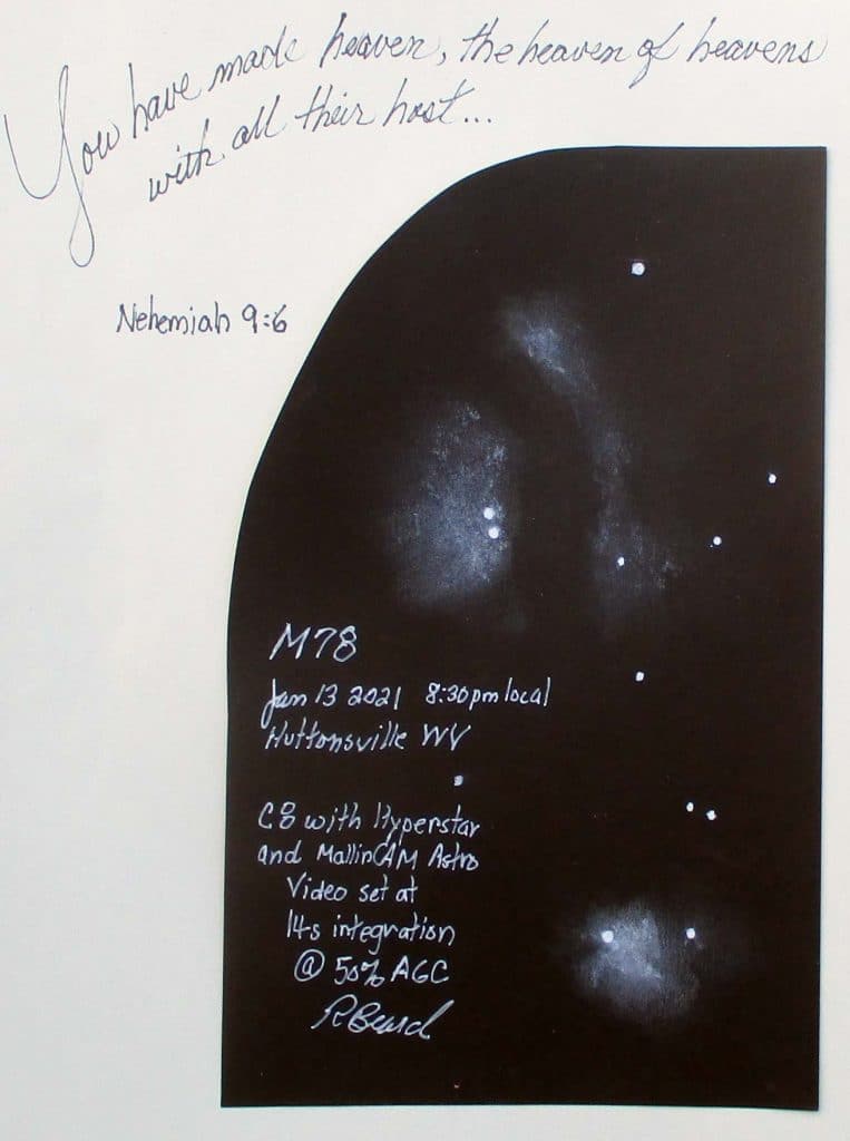 In our neck of the woods, which is in the middle of the mountains in eastern West Virginia, we do not get clear nights very often during Winter. But when we do, it is like playing in a candy store when you can anything you want. The stars on January 13, 2021 were beautiful. The weather had not clouded in as predicted, and I wanted to show my Lovely the Flame Nebula.