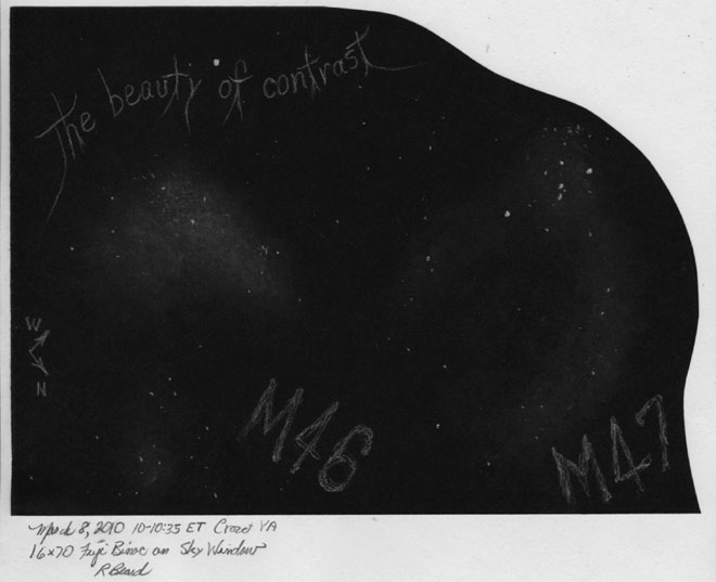 Clusters, which can be “open” or “globular,” are unique by the numbers of stars that are dominant and their overall appearance. The mini-patterns you find in open clusters (these two are open clusters) vary quite a bit. This sketch shows you two open clusters in the same quadrant of the heavens but they are quite different. I sketched them side by side to draw attention to their differences.