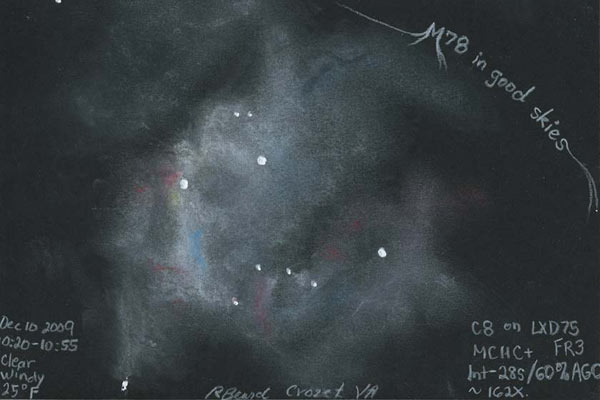 Technical Note: M78 with a small telescope is a hazy whitish area that has two stars in the midst. Sometimes a third star can be see. With the assistance of astro-video on a telescope and carefully studying the monitor output from the camera, I can see the shape of the nebulosity and a little of the color that the sketch records.