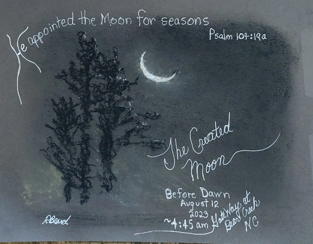 The alarm at 3:30 am jarred me awake but my wife was already stirring. The day had come to make a trip to help a daughter in Montana, and our ride to the Raleigh-Durham airport was an hour to make the first of two flights. While she dressed, I grabbed a peek of the eastern sky and saw the crescent moon. As we headed to the car, I mentioned the waning crescent that was so beautifully hung just above the tree line at Gateway, our little home in Bear Creek, NC. That got her excited, so she spotted it a dozen times on the way to the airport.