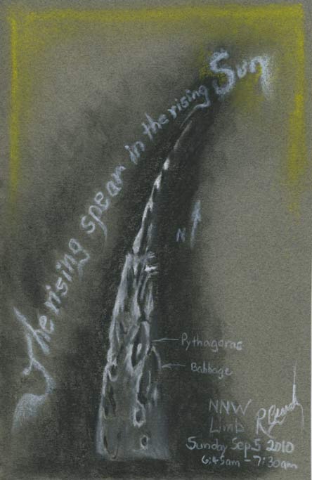 A friend commented to me that our friends in Uganda must enjoy the sky, because it is so dark (sky conditions are excellent). But that is not the case! We learn about anything because we observe and think about it. If no one has taught us to observe, we seldom learn. The heavens are that way. Dark skies do not mean people observe anymore than fish in a pond means that people obviously will go fishing. And, in a world blitzed with media, observing the created world around us is getting lost. It is getting so lost that parents, in many cases, have forgotten the value of teaching their children to watch and learn about things around them. It is easier to give them a video game or a phone. The culture around this is not healthy, and it is one of the reasons why we teach people to observe the heavens. It brings them back to fundamentals: seeing what God has created. Here is a sketch done around sunrise. It is not an uncommon sight in physical terms, but a rare sight in terms of people realizing there is opportunity to see an early morning crescent during the last part of every lunar cycle. The sketch is the upper limb of the crescent that I call a rising spear, since the moon is rising in the sky, but it is so thin that the sunlight quickly overwhelms the view. It disappears from sight very soon after sunrise. It makes a pretty sight for the eyes. This view incorporated a telescope with an astro-video camera so I could get a close view of the upper limb region and grab a couple craters.