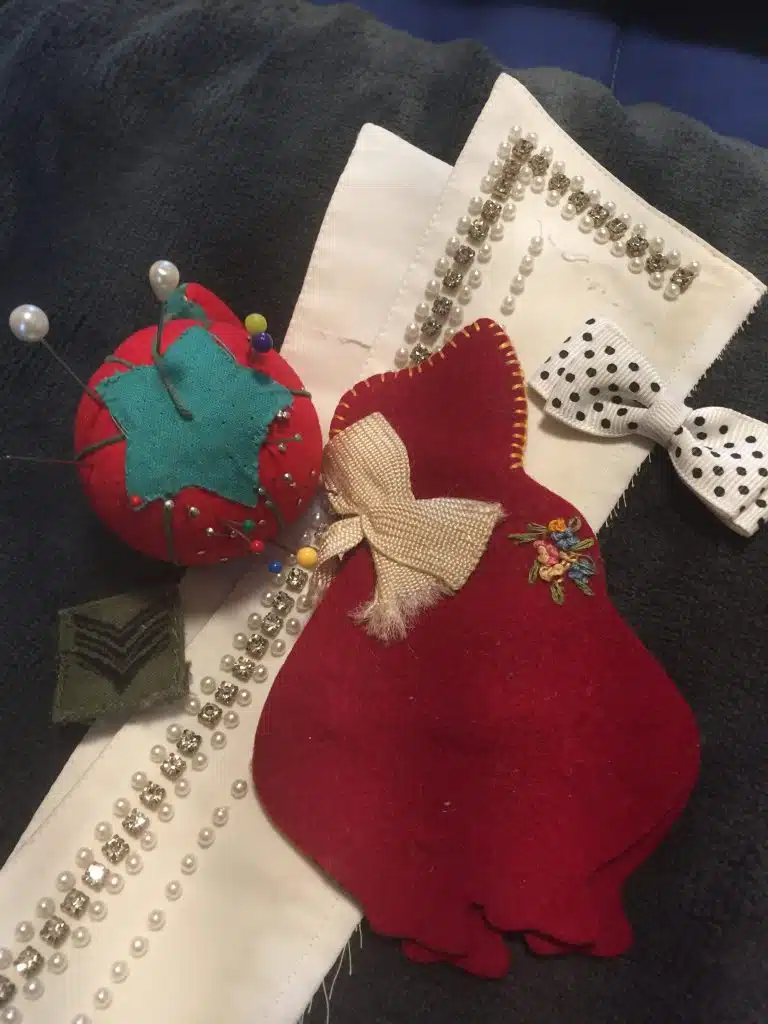 The box was in total disarray from having been ‘taped shut’ and packed away for yet another downsizing move. I emptied it out and was stunned by the number of memories it still holds inside. The button jar has holes in the top, revealing its previous life as a container for captured bugs or frogs. The Sunbonnet Sue felt needle holder, which had belonged to my grandmother, is still usable. T-shirts had once been transformed into night wear for the little girls, and I had kept two of the extra bows. The box holds assorted colors of patches and thread, multiple sized safety pins and snaps, and even an extra collar stay (left over from the day men’s shirts all had them). Some items in the box belonged to my mother and my grandmother – my examples of God-fearing older women. There is a tiny piece of chalk with the imprints of a woman’s fingers, fine crochet hooks, and a collar cut from her fancy blouse because the beading could be reused. There is even the Army stripe patch that was clipped off and salvaged from a shirt disposed of long ago – very long ago.