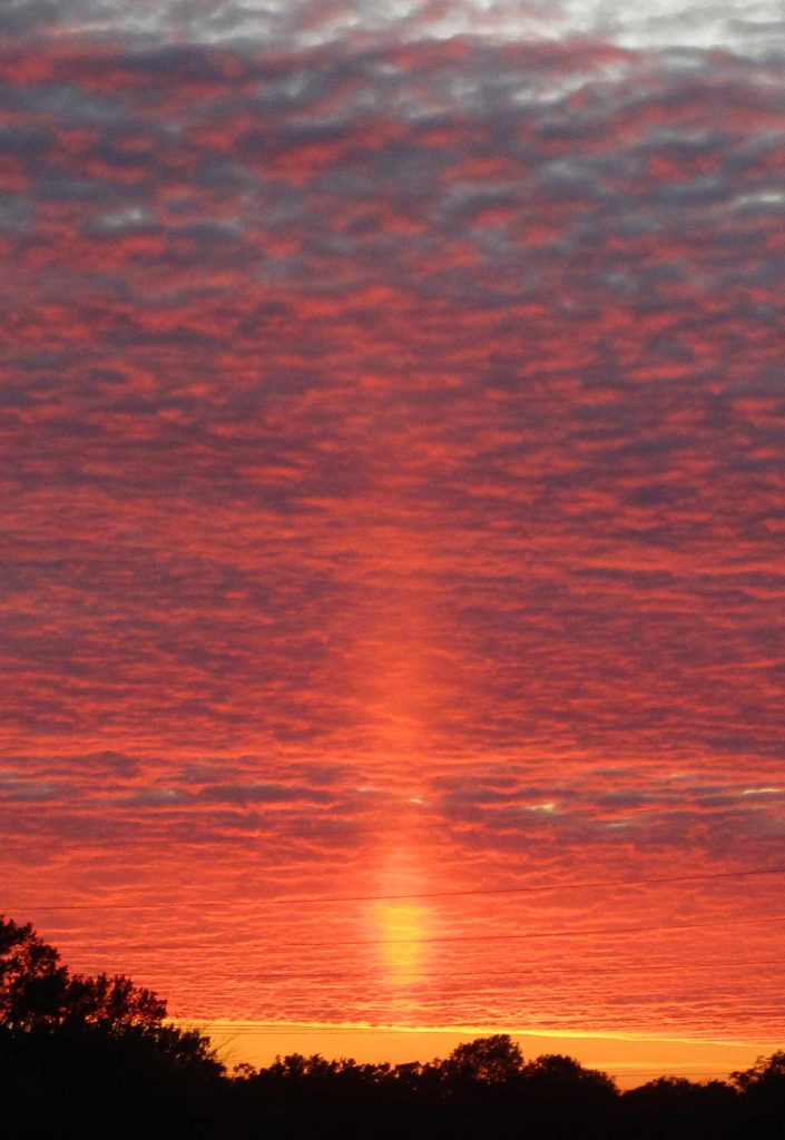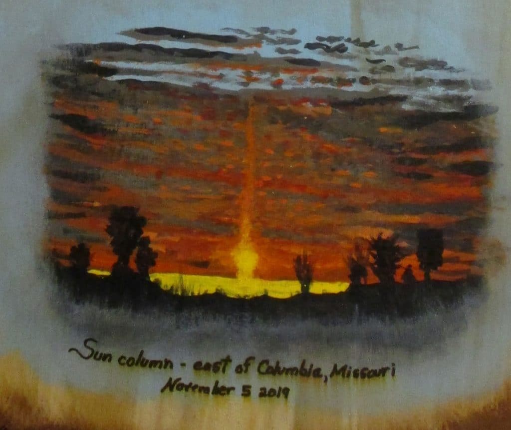 We were bustling eastward down the interstate at 70 miles per hour just east of Columbia, Missouri in late 2019. The pattern of clouds in the west, judging from my glances in the rear view mirror, suggested that a sun column might be possible in a few minutes.