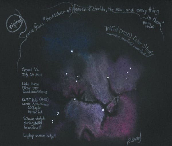 One popular object to see and one of the most photographed in the last 50 years is the Trifid Nebula or M20. The sketch below was developed in my backyard during an observing period in July 2011. With an 8 inch telescope, a good night, and good eyes an observer can just begin to make out the divisions in the stellar cloud. With astro video tools and a 12.5 inch telescope, I can see the dark lanes quite clearly as well as the color in this stellar gem.