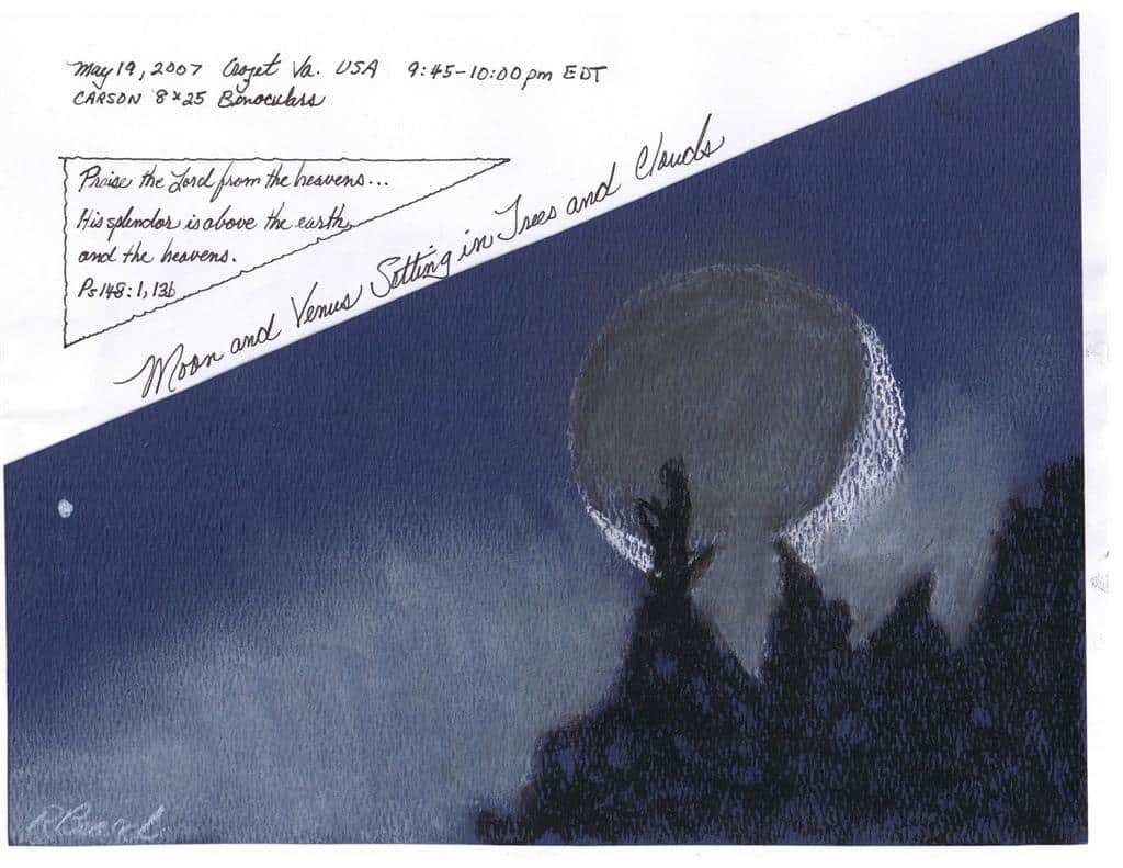 We returned home from a long medical day. A light rain started falling. Three days of high humidity and now the rain brings the clouds below the tops of the Appalachians. You see mountains for a few hundred yards up the slope but everything above that is lost in the mist. Tonight a cold front slowly passes but will have little wind. This sets up conditions for fog yielding to sun in the morning when the waning moon will still be high in the sky. In the meantime, the night will be very quiet, wet, and still. It reminded me when we began sketching the heavens a little over 5 years ago, when this sketch was done under similar conditions during a mid evening period in May 2007:
