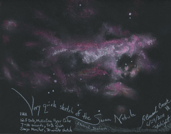 The sketch below is a simple one because it was done rapidly. My objective was not the detailed structure of the gas clouds, but the general shape and color of the object. In practical terms, I was also tired after chasing edge-on galaxies, it was late, but I did not want to stop without a  quick look at M17 using a color astro video camera.  The colors are over simplified in the sketch and they are not entirely correct. So when you look over the sketch, realize it is an UNDERSTATEMENT of it’s dynamic color and structure. In closing, I want to echo the sentiment of 3 verses of Psalm 150: