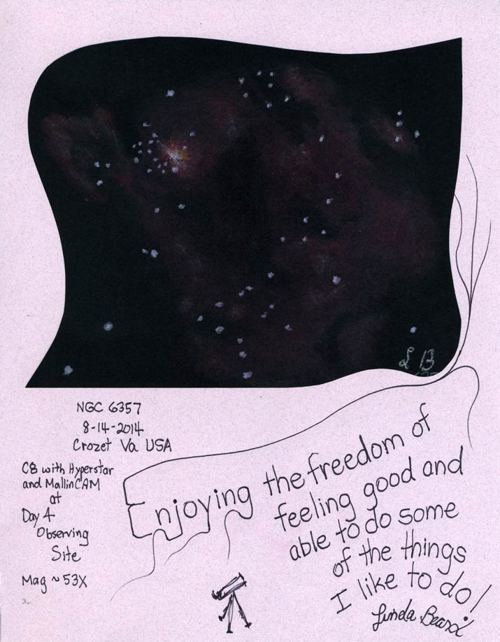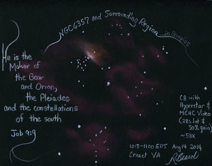 The title conjures up some images but this one is a little different. By the time Linda and I were observing the constellations of the south and decided to go for an object in the Scorpius constellation, we had to race the trees. That 15 degrees of sky motion per hour meant that tree branches would interfere with the line of sight to this pretty little object by just before 11 pm. Sure enough, about 10 minutes before the hour a black and blurry blob was entering the scene. The object faded within 10 minutes and our opportunity to study and sketch was over.