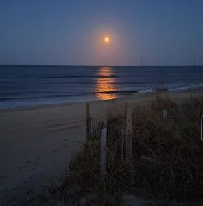 Full moonrise on the ocean shows a similar change. As the sun sets, darkness approaches slowly. The winds calm, bird flight becomes sporadic, and the brightest stars slowly appear. Then the full moon, hidden at first by sea fog, appears like a dim red-orange bulb a little above the horizon. It takes a couple hours for the night sky to fully appear. By that time the moon is high; its brightness makes the stars seem faint.