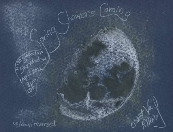 It’s not unlike the picture of Spring rains that feed the ground. Every farmer waits for them. The new season of planting is utterly dependent on it. Of course there are artificial ways to get water to the earth, but in most places in the world, rain is still the primary source. The evening of April 1st was one of those nights of waiting for water for the thirsty land. Light Spring rains were forecast but the moon was still visible through the incoming haze and bands of clouds. Under these conditions, the sketch below was developed. It is a simple capture of the major lunar “seas”, the curve of the mountains around Sinus Iridum that were lighted in a curve beyond the terminator, and a few other features. 3 hours later the skies were clear; the forecasted rains never came. It was just a reminder…again…that real water for the soul is Christ in the heart. Substitutes are forecast to do some good but they don’t.