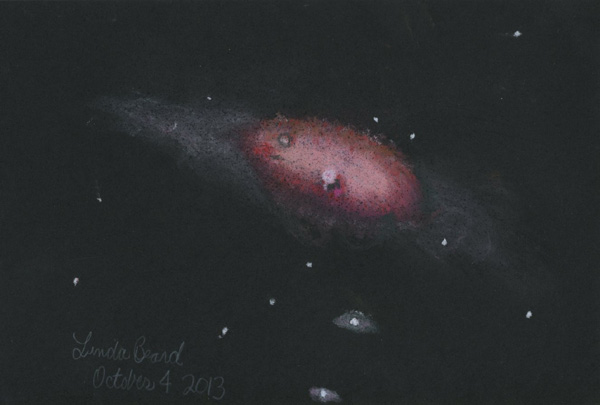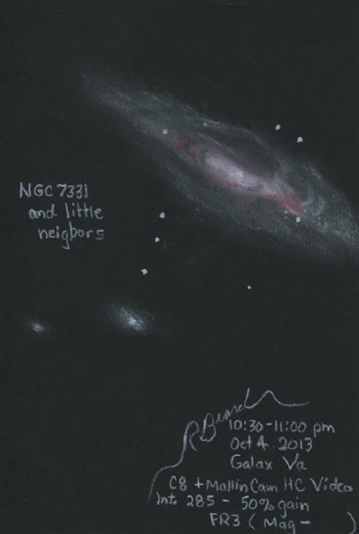 Before we begin, let us have an example before us. Linda and I sketched one galaxy one night, which is known as NGC 7331. It is not hard to find as a smudge of faint white in the constellation of Pegasus with a medium-sized backyard telescope, but we use a little astro-video camera to get to a little more detail. So from a little spot near Galax, Virginia, we watched the screen that showed the output of the video and sketched for about 30 minutes. She went for the color and density of object in her observation; I went for the over all structure in my observation. We both used the same equipment and sketched at the same time.