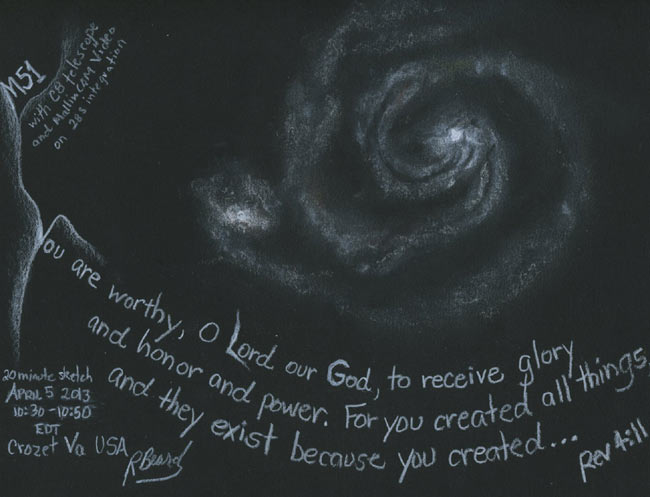 So on April 5, 2013 I had a chance to observe this magnificent object again. I had sketched it before, but every observation is a little different and I learn something else about the physical appearance of these two galaxies each time I observe it. However, this is where the observation ends and I go to the Eyewitness account to know about its origin. Here is the observation sheet developed in about 20 minutes by watching the screen video output from a telescope and video camera combination: